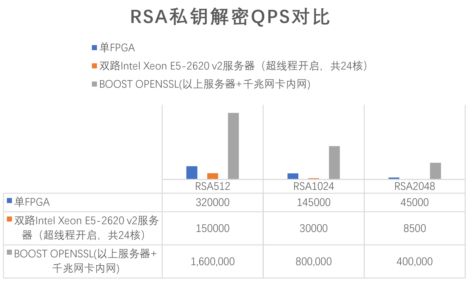 - 一个ASIC/FPGA 加速卡拥有50,000次/秒的RSA (2048位)操作,相当于5台双路Intel Xeon E5-2620 v2服务器(超线程开启,共24核)。